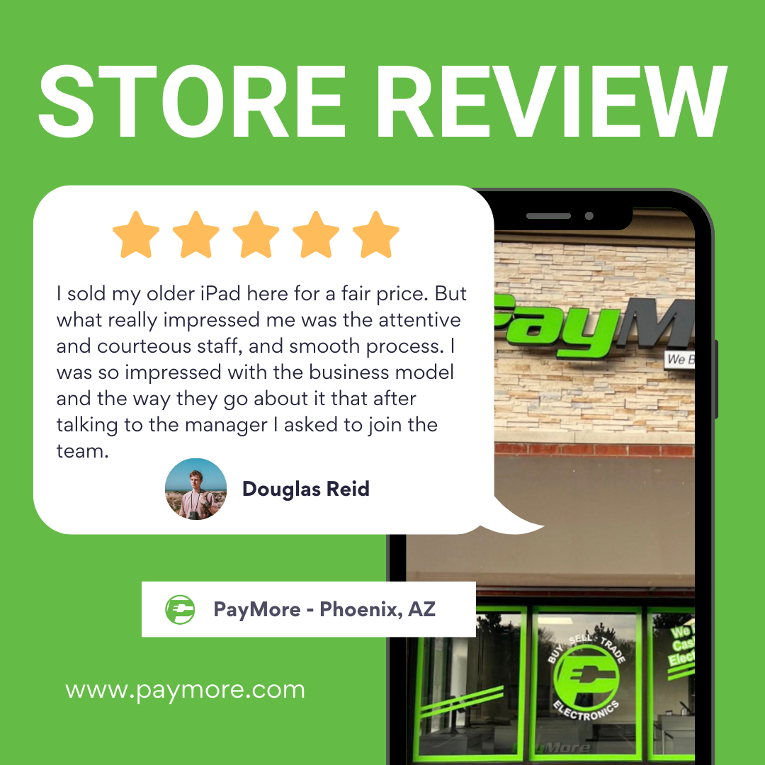 Fed up with trading in your old devices to cell phone carriers for extended service? Uncomfortable meeting strangers in dark alleys to sell your old laptop? Tired of the hassle of selling your old tech online and concerned about data security? PayMore® Stores has the solution. Receive top-dollar cash payouts for your tech on the spot in our clean, safe, and secure store. We fully reset your device and remove all your data. Walk into a PayMore® Store, walk out with cash.